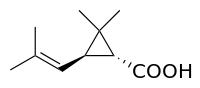 Biosynthesis: Chrysanthemic acid is derived from its pyrophosphate ester, which in turn is produced naturally from dimethylallyl diphosphate: